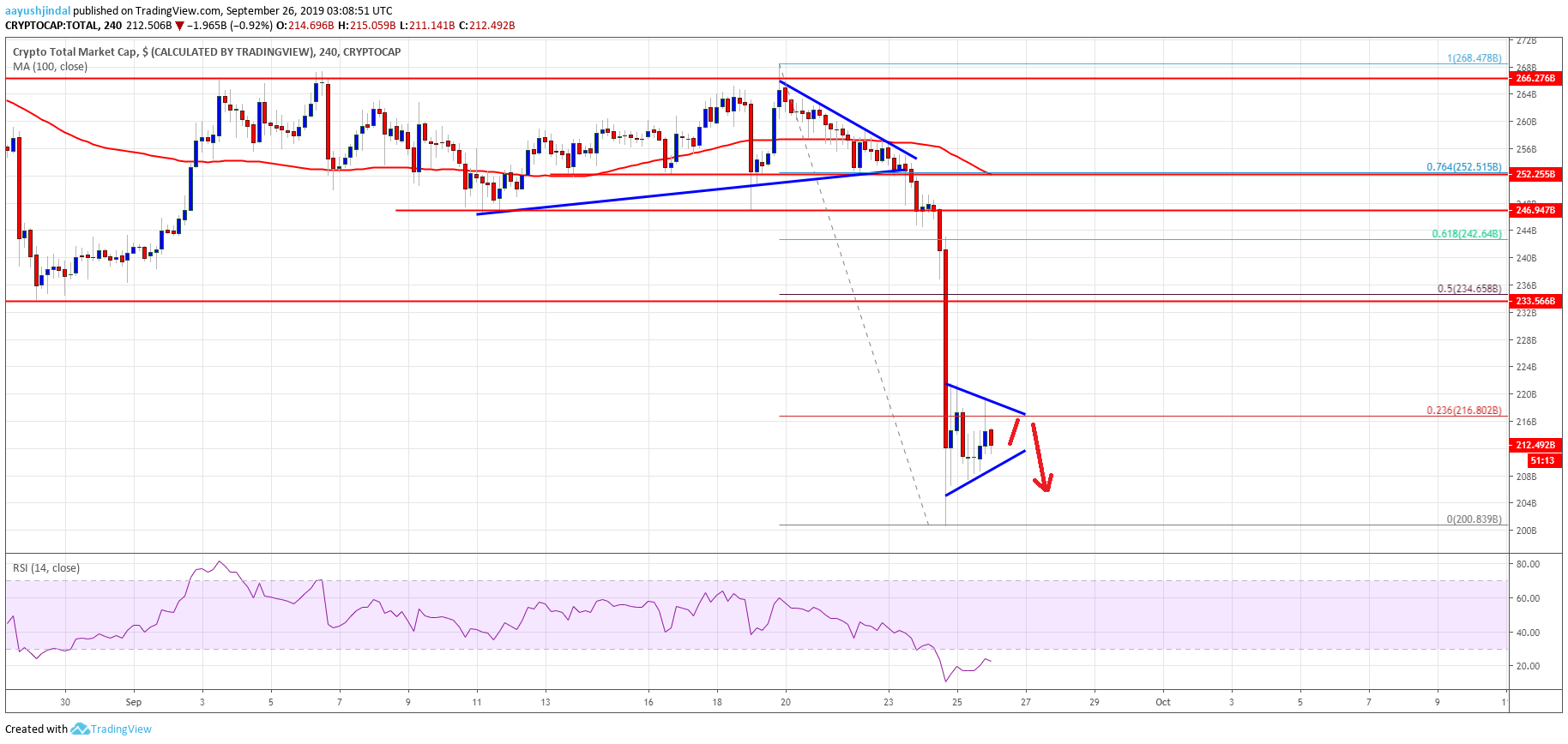 Looking at the total cryptocurrency market cap 4-hours chart, there was a nasty decline below the key $250.0B support area. The market cap declined around $50.0B and tested the $200.0B support area. It is currently consolidating losses above $210.0B. However, it seems like there is a bearish continuation pattern forming with resistance near $220.0B. If there is a downside break below $208.0B and $205.0B, there are chances of more losses in bitcoin, Ethereum, EOS, litecoin, ripple, binance coin, BCH, TRX, XMR, XLM and other altcoins in the near term.