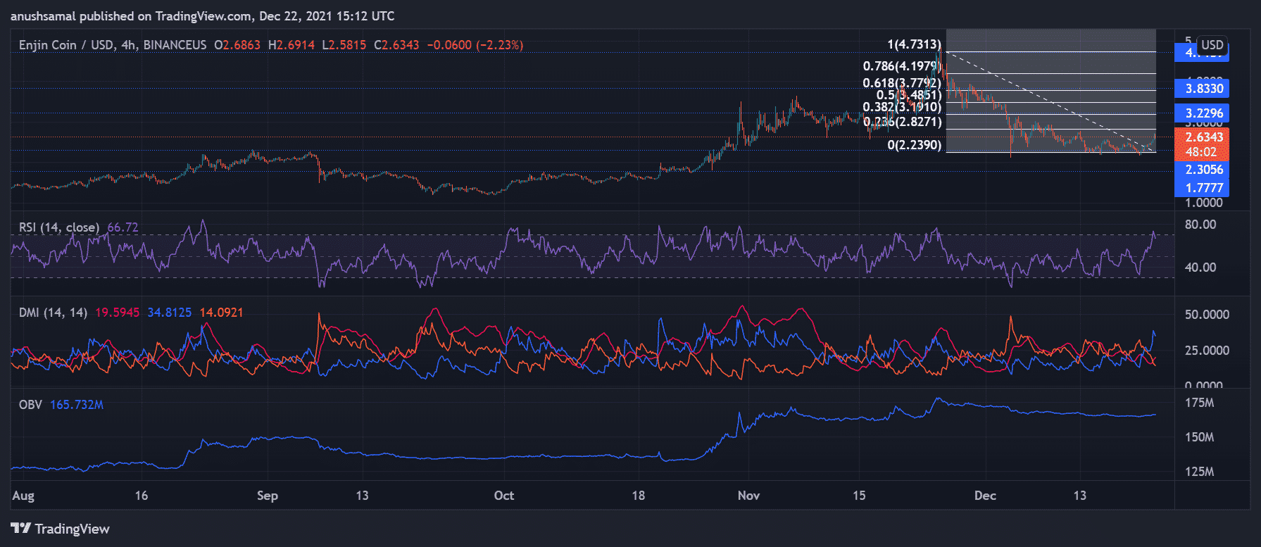 Enjin traded 10% higher than yesterday at $2.63, with its immediate price resistance at $3.22 at press time. After registering a sharp pullback from the 78.6% Fibonacci level and then at the 38.2% Fibonacci level, the price action of Enjin remained quite lateral and mundane.